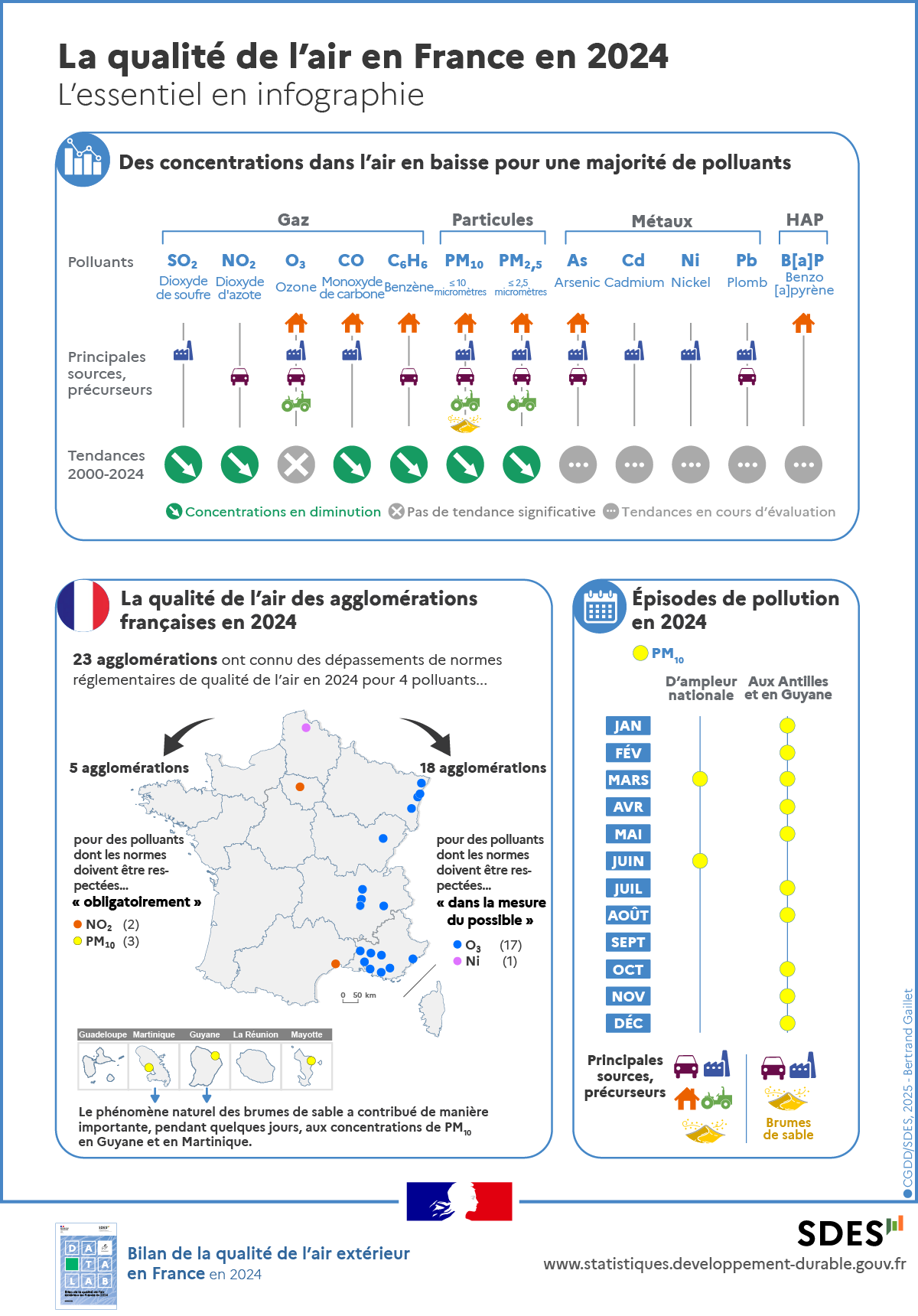 Le bilan de la qualité de l'air 2024 est publié 15 octobre 2025 A l’occasion de la Journée nationale de la qualité de l’air, le Service des données et études statistiques du ministère en charge de l'environnement publie le bilan annuel 2024 sur la qualité de l’air en France. Comme chaque année, l’Ineris et le LCSQA ont contribué à sa réalisation. Ce bilan confirme que la qualité de l’air s’améliore globalement, en lien avec la réduction des émissions de polluants. Toutefois, même si les teneurs en polluants dans l’air baissent, des dépassements de normes réglementaires de qualité de l’air pour la protection de la santé persistent dans certaines zones. Le rapport détaillé offre un aperçu global de l’évolution des émissions de polluants et des niveaux de pollution à l’échelle nationale, et souligne les progrès ainsi que les défis en matière de qualité de l'air. Il s’appuie sur les données issues du dispositif national de surveillance mis en œuvre au niveau régional par les associations agréées de surveillance de la qualité de l’air (AASQA) et centralisées dans la base de données nationale Geod’air.L’Ineris, au travers du Laboratoire central de surveillance de la qualité de l’air (LCSQA), est responsable de la gestion de cette base de données et de sa diffusion en open data. Ces données sont également transmises à l’Agence européenne pour l’environnement (AEE).Combinées aux données de la plateforme nationale de prévision de la qualité de l’air Prev'air, les données de Geod’air sont également utilisées par l’Ineris pour établir des cartes de pollution couvrant l’ensemble du territoire, ensuite diffusées en open data. Ces données et ces cartes permettent une analyse approfondie des tendances annuelles et aident à évaluer l’efficacité des politiques publiques en matière de qualité de l’air.Les résultats du bilan 2024 soulignent l’importance des efforts faits et défis à venir, pour améliorer la qualité de l'air dans un contexte de renforcement de la réglementation avec la transposition prochaine de la directive européenne sur la qualité de l’air ambiant, officiellement adoptée en octobre 2024 par le Conseil de l'Union Européenne.Le bilan complet sur le site du SDES et les données sur la qualité de l’air via les plateformes Geod’air et Prev'air Principaux chiffres sur la qualité de l'air et les émissions de polluants en France en 2024