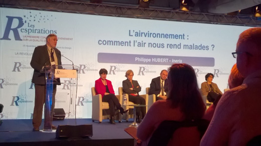 Conférence Les Respirations 2016 16 novembre 2016 Le 15 novembre, l'Ineris a participé à la conférence Les Respirations qui rassemble chaque année toutes les parties prenantes autour de la qualité de l'air. Elle réunit scientifiques, ONG, politiques, chefs d'entreprises, étudiants, universitaires, écrivains, médecins, juristes... autour de tables rondes pour débattre sur le thème de la qualité de l'air. Trois thématiques majeures ont ponctué cette journée à laquelle nos experts, Philippe Hubert et Laurence Rouil, ont participé : La santé : « L’Airvironnement : comment l’air nous rend malades ? » L’air intérieur : « Du bâtiment à basse consommation au bâtiment bonne respiration » L’air extérieur : « Faire respirer la ville intelligente »