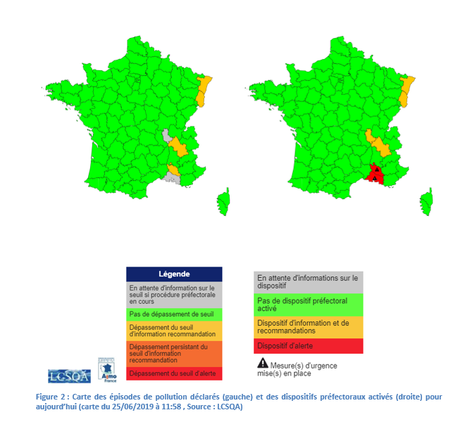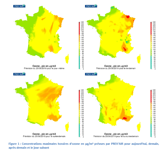 Episode de pollution à l'ozone : situation et évolution - 25 juin 2019 25 juin 2019 Vigilance sur les niveaux d’ozone en hausse dans plusieurs régions en lien avec la situation caniculaire. Les conditions météorologiques caniculaires qui sévissent sur une grande partie du pays favorisent la production photochimique d’ozone, de telle sorte que les concentrations d’ozone seront aujourd’hui élevées dans plusieurs régions avec des dépassements possibles du seuil d’information et de recommandation (180 µg/m3). L’ozone est un polluant secondaire qui se forme à partir de transformations chimiques des émissions d’oxydes d’azote et de composés organiques volatils. Ces processus sont généralement des phénomènes de grande ampleur géographique. Les régions Grand-Est, Auvergne Rhône Alpes, Provence Alpes Côte d’Azur et Ile de France seront exposées à des concentrations d’ozone assez élevées, avec possiblement des dépassements localisés du seuil d’information et de recommandation. Pour demain, la situation qualité de l’air devrait encore s’aggraver avec des conditions encore plus favorables à la formation d’ozone avec des températures plus élevées qu’aujourd’hui et des masses d’air plus sèches. Ces conditions devraient sévir jusqu’au week-end prochain avec maintien des concentrations d’ozone à des niveaux élevés. Les cartes ci-dessous illustrent les maxima horaires d’ozone prévus pour aujourd’hui, demain et après-demain. Une carte à J+3 est également fournie à titre indicatif (avec indice de confiance plus limité), pour disposer d’une tendance sur l’évolution. En figure 2 sont représentés les départements dans lesquels un épisode de pollution a été déclaré par les réseaux agréés de surveillance (carte de gauche) et ceux pour lesquels une procédure préfectorale est activée (carte de droite) à l’heure d’établissement de ce bulletin[1] conformément aux dispositions de l’arrêté du 26 août 2016 modifiant l'arrêté du 7 avril 2016 relatif au déclenchement des procédures préfectorales en cas d'épisodes de pollution de l'air ambiant. Ces cartes sont susceptibles d’évoluer tout le long de la journée, voir le site LCSQA.org