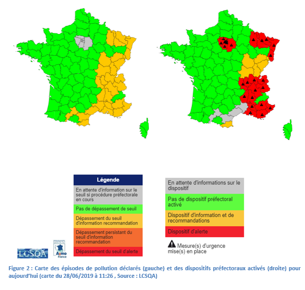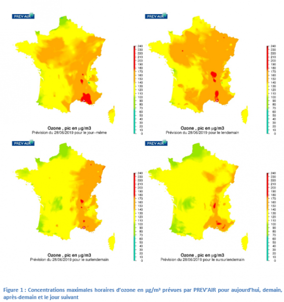 Episode de pollution à l'ozone : situation et évolution - 28 juin 2019 28 juin 2019 Vigilance sur les niveaux d’ozone élevés à très élevés dans plusieurs régions en lien avec la situation caniculaire. Les conditions météorologiques toujours caniculaires sur une grande partie du pays favorisent la production photochimique d’ozone, de telle sorte que les concentrations d’ozone ont été très élevées hier dans plusieurs régions avec notamment quelques dépassements du seuil d’alerte (240 µg/m3) et de nombreux dépassements du seuil d’information et recommandations (180 µg/m3). Cette situation devrait perdurer aujourd’hui. L’ozone est un polluant secondaire qui se forme à partir des transformations chimiques des oxydes d’azote et des composés organiques volatils principalement émis par le trafic routier et les activités industrielles. Le couvert végétal peut aussi être une source naturelle de composés organiques volatils plus ou moins importante selon les essences et les conditions météorologiques. La formation de l’ozone est fortement dépendante des conditions météorologiques (températures élevées, rayonnement solaire important) et donc des zones géographiques considérées. Pour aujourd’hui, les régions Provence Alpes Côte d’Azur et Auvergne Rhône Alpes seront exposées à des concentrations d’ozone élevées à très élevées, avec des dépassements du seuil d’information et de recommandation et de possibles dépassements du seuil d’alerte. Des concentrations élevées avec dépassements du seuil d’information et de recommandation sont également attendues sur l’Occitanie. L’Ile de France, Bretagne, Centre-Val de Loire, Pays de la Loire, Normandie, Grand-Est et Bourgogne-Franche-Comté devraient connaitre des concentrations assez élevées avec de possibles dépassements du seuil d’information et recommandation. L’épisode devrait se poursuivre ce week-end. Les cartes ci-dessous illustrent les maximas journaliers d’ozone prévus pour aujourd’hui, demain et après-demain. Une carte à J+3 est également fournie à titre indicatif (avec indice de confiance plus limité), pour disposer d’une tendance sur l’évolution En figure 2 sont représentés les départements dans lesquels un épisode de pollution a été déclaré par les réseaux agréés de surveillance (carte de gauche) et ceux pour lesquels une procédure préfectorale est activée (carte de droite) à l’heure d’établissement de ce bulletin[1] conformément aux dispositions de l’arrêté du 26 août 2016 modifiant l'arrêté du 7 avril 2016 relatif au déclenchement des procédures préfectorales en cas d'épisodes de pollution de l'air ambiant. Ces cartes sont susceptibles d’évoluer tout le long de la journée, voir le site LCSQA.org
