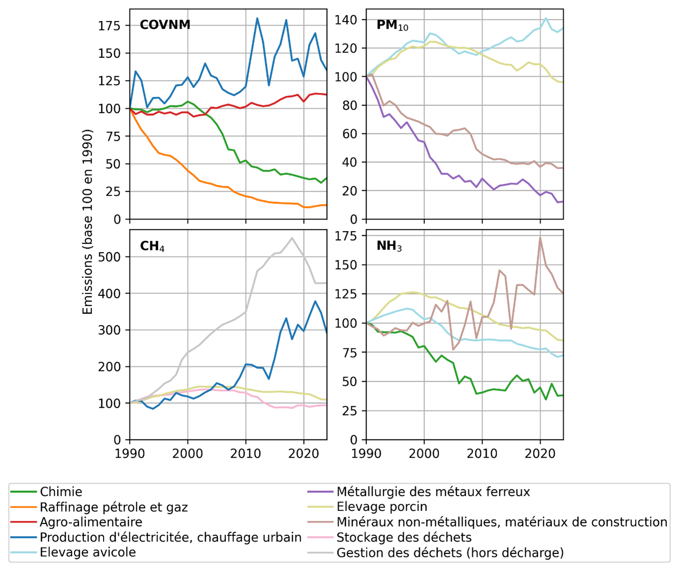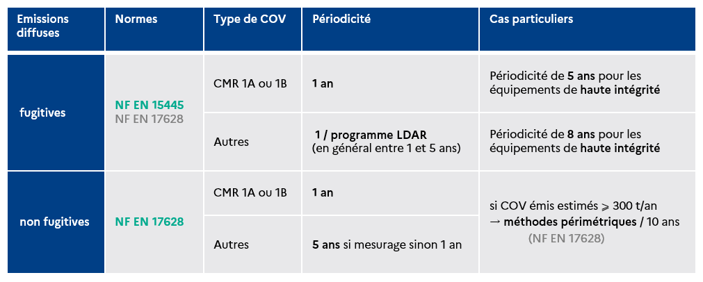 Stratégies et méthodes de caractérisation adaptées aux émissions diffuses, notamment dans le secteur de la chimie Les émissions diffuses, définies par opposition aux émissions canalisées, ont des caractéristiques diverses en fonction de leurs origines. Elles touchent de nombreux secteurs industriels, tels que l’industrie chimique. Du fait de leur nature et de leur variabilité temporelle, les flux d’émissions diffuses restent difficiles à quantifier. L’Ineris, par ses activités de recherche, d’appui aux pouvoirs publics et de services aux entreprises, contribue au développement et à l’application de méthodes adaptées aux différentes sources et aux obligations introduites par la Directive sur les émissions industrielles (IED). Enjeux associés aux émissions diffuses selon les secteurs et les polluants En guise d’illustration, les graphiques suivants présentent, pour 4 polluants engendrant des émissions diffuses significatives, la part en pourcentage des émissions industrielles totales dans l’air en France, attribuable à chacun des secteurs d’activité, tels que définis au sein du registre européen des rejets et transferts de polluants (E-PRTR devenu E-EIP* en 2024). Ces graphiques ont été obtenus à partir des données déclarées en 2024 sur la base de données du registre français des émissions polluantes et des déchets (BDREP). Ils soulignent l’importance d’accorder une attention plus particulière aux émissions diffuses, notamment dans le cadre des révisions des BREF, en cours ou à venir, pour les secteurs de la chimie industrielle (organique et inorganique), du raffinage de pétrole et de gaz, de la sidérurgie, du traitement de surface, de la fabrication de papier/carton, de l’élevage intensif de porcs et de volailles, des traitements/transformations destinés à l’agro-alimentaire, de la gestion des déchets, des installations de combustion et de la production de ciment et de chaux. Figure 1 : Répartition des émissions totales industrielles en France par activité E-PRTR en 2024 (données BDREP) La question des émissions diffuses a été soulevée au sein du BREF REF (Raffineries) pour les émissions fugitives (fuites des brides, vannes, etc.) puis dans les BREF CWW (Systèmes communs de traitement et de gestion des eaux et des gaz résiduels dans l'industrie chimique), STS (Traitement de surface utilisant des solvants) et WT (Traitement des déchets). Plus récemment, dans le BREF WGC (Systèmes communs de traitement et de gestion des gaz résiduels dans l'industrie chimique), des exigences de quantification pour les émissions diffuses (notamment issues des évents et des bassins) sont apparues en complément de celles existantes sur les émissions fugitives (voir l’exemple sur le secteur de la chimie). Par ailleurs, des travaux pour les prendre en compte sont en cours au niveau européen pour la révision du BREF LVIC (Chimie Inorganique Grand Volume), l'élaboration du BREF LAN (Décharges) et pour l'élaboration des conditions uniformes relatives aux règles d'exploitation des élevages de volailles et de porcs, qui viendront se substituer aux dispositions contraignantes du BREF IRPP. Les BREF I&S (Aciéries) et CLM (Production de ciment, chaux, et magnésie), secteurs dans lesquels les émissions diffuses sont également importantes (cf. graphe), vont faire l’objet d’une révision d’ici quelques années.Pour mieux appréhender l’impact des émissions diffuses, les évolutions des émissions totales déclarées ont été tracées, en base 100 en 1990, à partir des données Secten du Citepa** sur les principaux secteurs concernés pour les 4 polluants représentés sur la Figure 1. Il est à noter que les sous-secteurs Secten présentent des différences avec les secteurs d’activités E-PRTR. La chimie et le traitement de surface ne sont pas dissociés et certains sous-secteurs sont regroupés. Figure 2 : Evolution des émissions totales industrielles pour 4 polluants et par secteur industriel (données SECTEN) Si une nette diminution des émissions canalisées a généralement été observée depuis 1990, un ralentissement manifeste de la baisse des émissions totales est à présent constaté dans les inventaires nationaux pour les polluants les plus sujets aux émissions diffuses dans le secteur industriel. Par exemple, pour les COVNM, PM10, CH4 et NH3, émis significativement de manière diffuse, les émissions nationales passent un point d’inflexion et stagnent parfois depuis plus d’une dizaine d’années, voire croissent dans certains secteurs d’activité spécifiques. Ainsi, les émissions diffuses peuvent représenter aujourd’hui une proportion majoritaire des émissions totales de certains secteurs et certains polluants (voir l’encadré « quelques chiffres »). Il est à noter que ces émissions pourraient même être sous-estimées du fait du manque de connaissances sur les facteurs d’émissions propres au diffus.La difficulté à détecter et quantifier les émissions diffuses limite la possibilité de les réduire. D’une part, elle empêche de localiser et de hiérarchiser de façon fiable les sources diffuses, parfois nombreuses et dispersées, à l’échelle d’un site. D’autre part, des méthodes validées et normalisées sont nécessaires pour surveiller et réglementer les émissions. Principales sources et origines des émissions diffuses Les émissions diffuses ont des origines multiples et sont issues notamment : - de défauts d’étanchéité d’équipements (pompes, compresseurs, joints, vannes, filtres, brides, et autres éléments de tuyauterie). Ces émissions sont dites fugitives ;- du stockage de produits ou de procédés de traitement(dans des bassins, cuves ou bâtiments ouverts, sur des surfaces à l’air libre…) ; - du fonctionnement d’un équipement (ventilation d’un bâtiments ouverts par exemple) ou d’un procédé (ouverture d’un réacteu